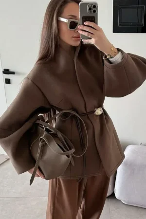 Women’s Retro Brown Woolen Overcoat Elegant Full Sleeves Waist Cinching Loose Coat 2025 New Autumn Office Lady Commute Outwear