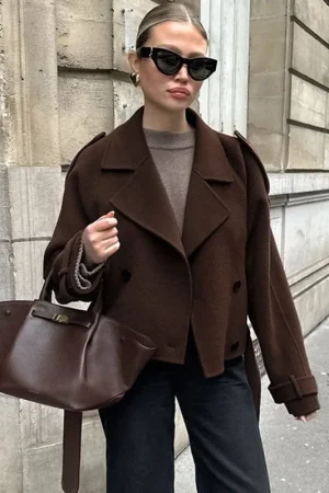 Talenza Brown Double Breasted Wool Coat Office Women’s Retro Lapel Short Jacket Loose Solid Autumn Winter Coat Female Outfits