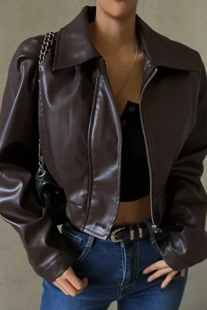 Faux Leather Jacket Women Fashion Brown PU Oversized Jacket Turn-Down Collar Zipper Cropped Jacket Coat Autumn Winter 2024
