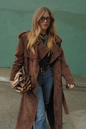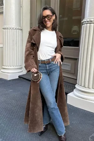 2024 Autumn Winter Elegant Suede Leather Belt Long Trench Brown Coat Fashion Warm Double Button Jacket High Quality Streetwear