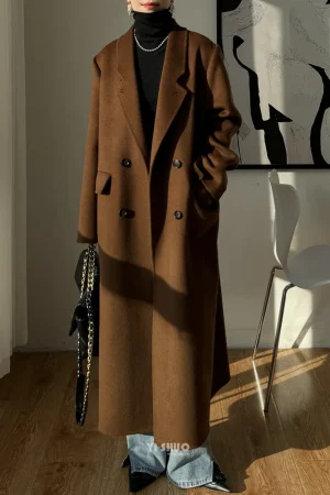 2025 Winter New High end Brown Double sided Wool Coat Women Long Stand up Collar Shoulder Straight Tube Woolen Coat for Women