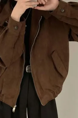 American Retro Brown Faux Suede Coat Women Fashion Lapel Solid Zipper Short Jacket 2025 Autumn Winter Long Sleeve Zipper Outwear