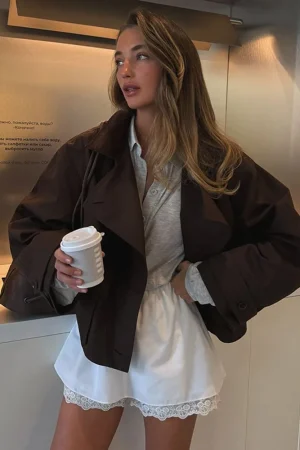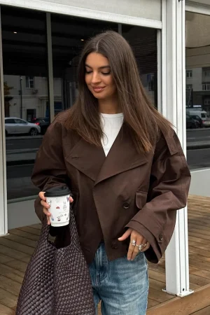 Brown Cropped Trench Coat Women Long Sleeve Lapel Single Breasted Pockets Jacket 2025 New Autumn Lady Daily Commuter Outerwear