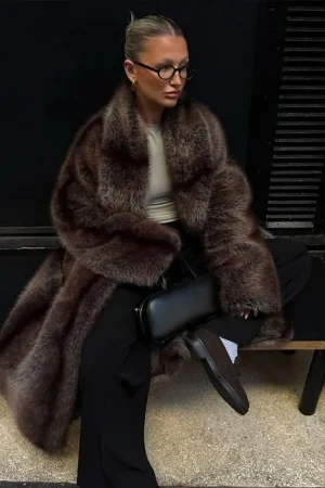 Fashion Brown Faux Fur Overcoat Women Luxury Lapel Long Sleeve Fluffy Coat 2025 Winter Female Thicken Warm High Street Outwear