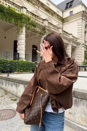 2025 Autumn Faux Suede Collared Jacket Women Shoulder Straps Loose Fit Stylish Crop Top Female Casual Brown Windbreaker Coats