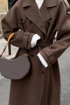 Women Fashion Brown Woolen Coat Double Breasted Long Sleeve Lapel Blends Jacket Autumn Winter High Street Windproof Outerwear